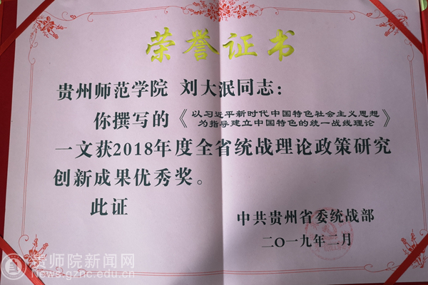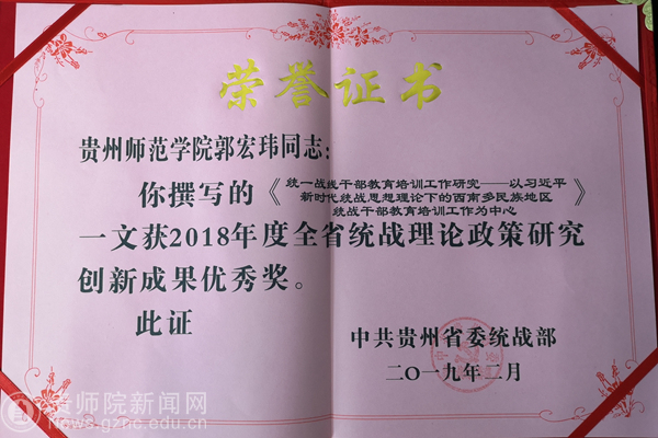 本网讯 近日,中共贵州省委统战部通报表彰2018年度全省统战理论政策研究工作先进单位和优秀个人及创新成果。全省各市州党委统战部、理论研究基地和省内高校等五十多家单位参加了此次活动,有六个单位获得表彰。