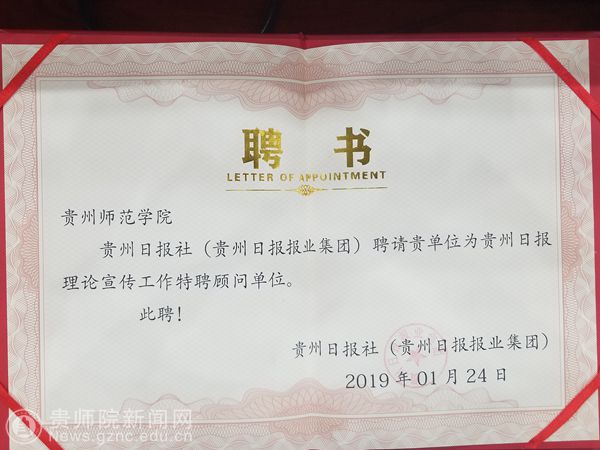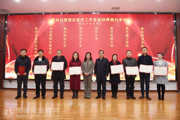 本网讯 1月24日下午,贵州日报报业集团举办了“创新理论宣传工作座谈会暨公众号‘大家理论’上线仪式”。beat365荣幸受邀成为贵州日报理论宣传首批顾问单位。省委宣传部常务副部长徐静出席活动并讲话。校党委宣传部部长邹晓青代表学校参加了座谈会并在上线仪式上接受了贵州日报社(贵州日报报业集团)为beat365颁发的聘书。