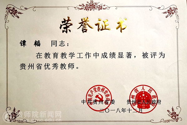 谭韬荣获贵州省优秀教师荣誉称号