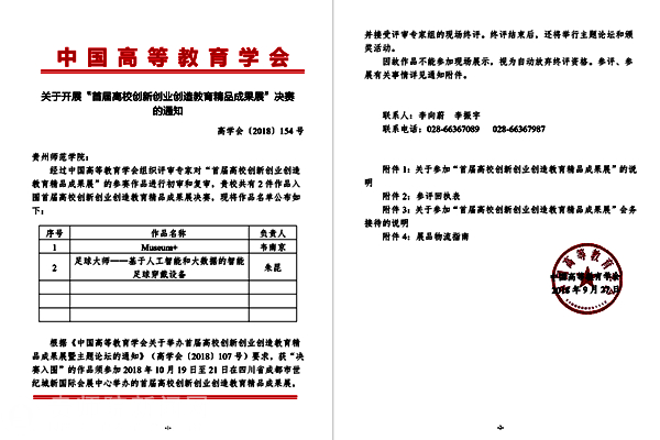 本次成果展共评选出特等奖4项,一等奖8项,二等奖16项,三等奖24项,优胜奖98项。文学与传媒学院选送的“足球大师”获三等奖,物理与电子科学学院选送的“Museum+”获优胜奖。