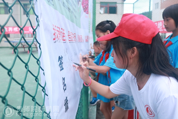 志愿者带领孩子们在禁毒喷绘签名墙上签名