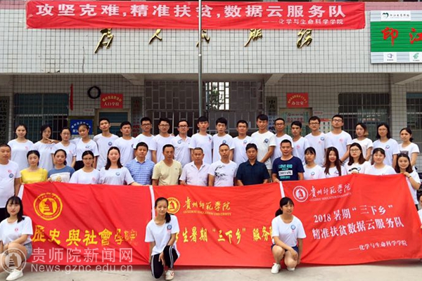 本网讯 在校党委领导和关心下,在校团委的组织和安排下,在驻村工作队大力支持下,2018年7月17日至24日,化学与材料学院、历史与档案学院、生物科学学院、设计学院等4个学院36名大学生组成的“精准数据云”服务队与青年政策宣讲社赴印江黔溪村进行为期七天的三下乡精准扶贫工作。