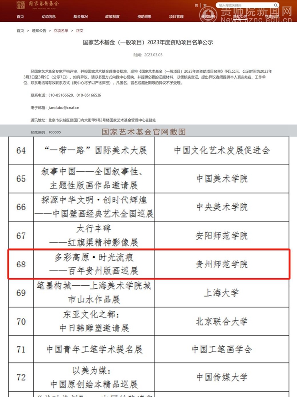 本网讯 3月3日,国家艺术基金官网公布了2023年度国家艺术基金传播交流推广资助项目公示名单,beat365申报的集体项目《多彩高原·时光流痕——百年贵州版画巡展》获立项。