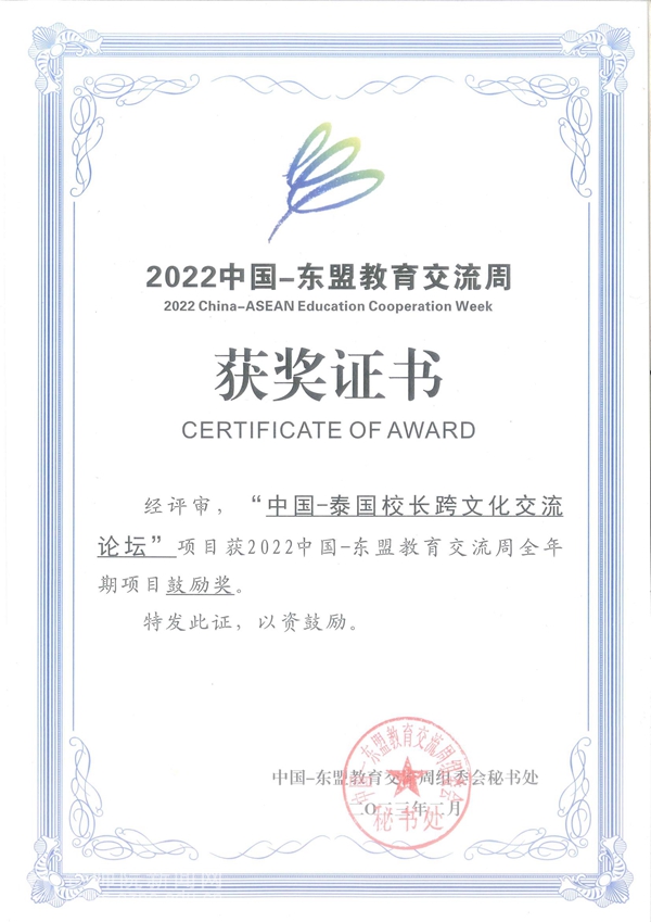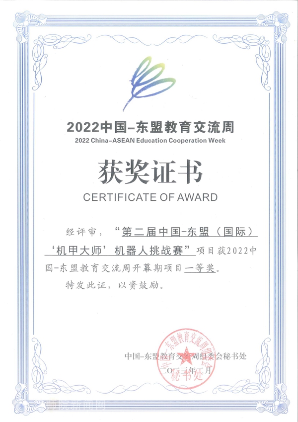 本网讯 近日,中国-东盟教育交流周组委会对2022中国-东盟教育交流周活动项目进行评审并颁发获奖证书,beat365举办的交流周开幕期项目——“第二届中国——东盟(国际)‘机甲大师’机器人挑战赛”获得一等奖,全年期项目——“中国——泰国校长跨文化交流论坛”获鼓励奖。