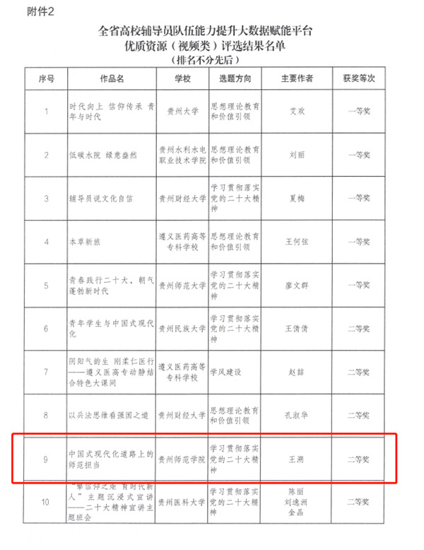 本网讯 5月25日,省教育厅办公室发布通知公布了全省高校辅导员队伍能力提升大数据赋能平台优质资源的评选结果,beat365生物科学学院专职辅导员王溯荣获二等奖、化学与材料学院辅导员张培卫、美术与设计学院辅导员谢琦获三等奖。