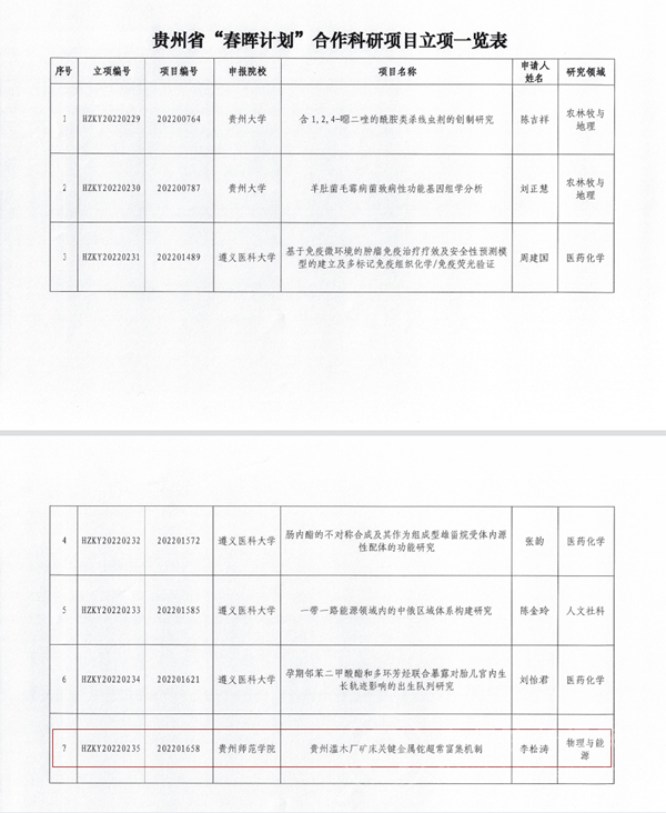 本网讯 近日,教育部国际合作与交流司公布了2022年度教育部“春晖计划”合作科研项目评审结果,beat365地理与资源学院李松涛老师申报的《贵州滥木厂矿床关键金属铊超常富集机制》成功获批立项。贵州省高校此次仅获批7项。