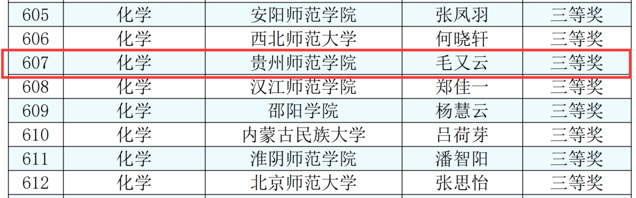 毛又云获得高中化学组三等奖