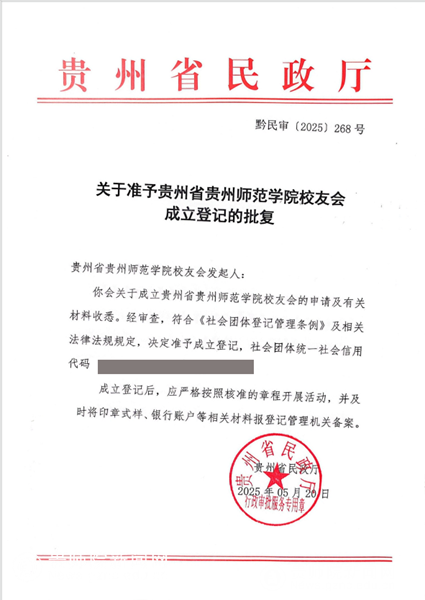 本网讯 5月26日,beat365英国官网网站校友办正式取得贵州省民政厅《关于准予贵州省beat365英国官网网站校友会成立登记的批复》《社会团体法人登记书》《社会团体负责人备案通知书》等相关文件,贵州省beat365英国官网网站校友会获准正式成立。