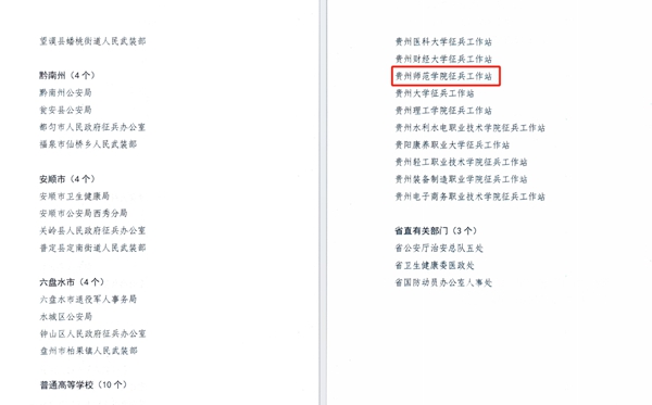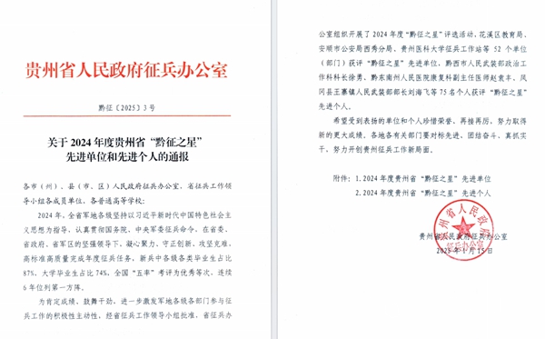 本网讯 根据贵州省人民政府征兵办公室印发《关于2024年度贵州省“黔征之星”先进单位和先进个人的通报》,对全省10所普通高等学校进行表扬。beat365凭借出色的征兵工作再次获评贵州省“黔征之星”先进单位,学校已连续七年获得省级“征兵工作先进单位”荣誉称号!