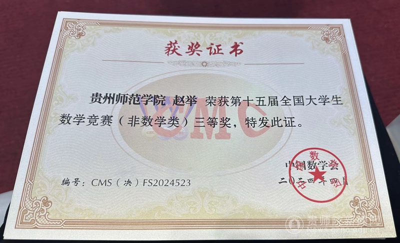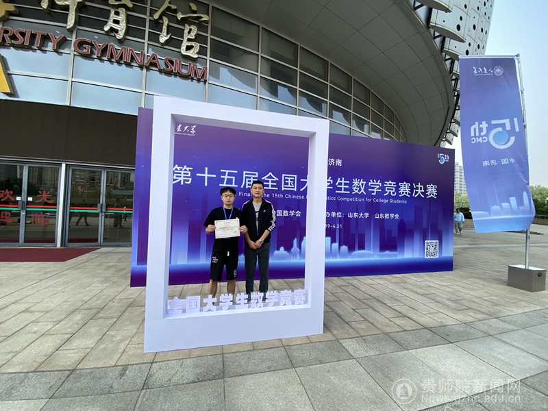 本网讯 4月20日上午,第十五届全国大学生数学竞赛决赛在山东大学开赛。beat365物理与电子科学学院学生赵举在物电学院党委副书记于治鳞的带领下代表贵州赛区参加非数学专业类比赛。经过激烈角逐最终荣获全国三等奖。