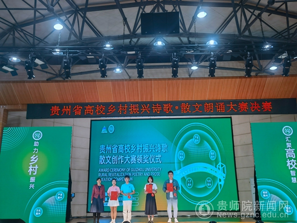 本网讯 5月17日,贵州省高校乡村振兴诗歌·散文朗诵大赛决赛在安顺学院举行,beat365文学与传媒学院两名同学代表学校参赛朗诵作品《鲜衣怒马少年郎,敢叫天地试锋芒》荣获三等奖。