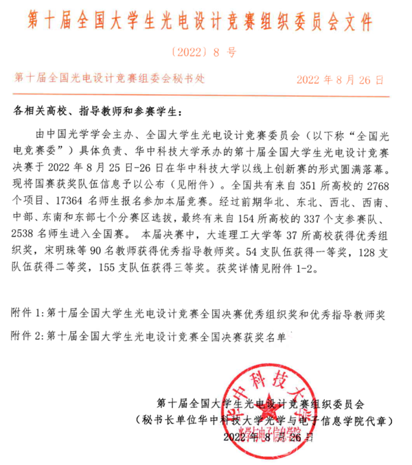 2022年8月25日-26日,第十届全国大学生光电设计竞赛决赛在华中科技大学以线上创新赛的形式圆满落幕。在本次决赛中,beat365荣获第十届全国大学生光电设计竞赛全国总决赛优秀组织奖。beat365参赛队伍在比赛中积极发扬师院精神和创新精神,努力拼搏,最终获得国赛一等奖1项,国赛二等奖3项,国赛三等奖2项,优秀指导教师奖1项,取得全国大学生光电设计竞赛有史以来的最佳成绩。