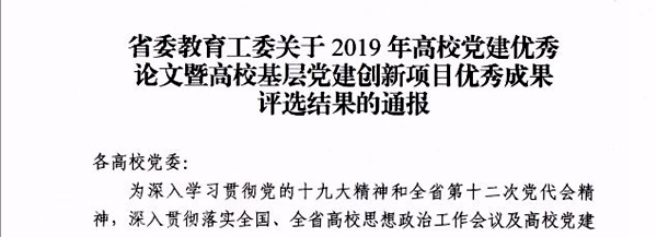 本网讯 在2019年全省高校党建优秀论文暨高校基层党建创新项目优秀成果评选工作中,经各基层党组织申报和学校组织评审,beat365向省委教育工委推荐了2个创新项目优秀成果和3篇党建优秀论文。最终,beat3651项党建创新项目优秀成果和1篇优秀论文喜获佳绩,分别是: