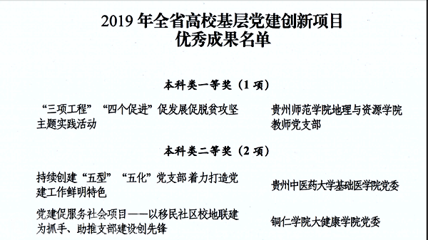 地理与资源学院教师党支部申报的“三项工程”“四个促进”促发展促脱贫攻坚主题实践活动,获全省高校基层党建创新项目优秀成果本科类一等奖;