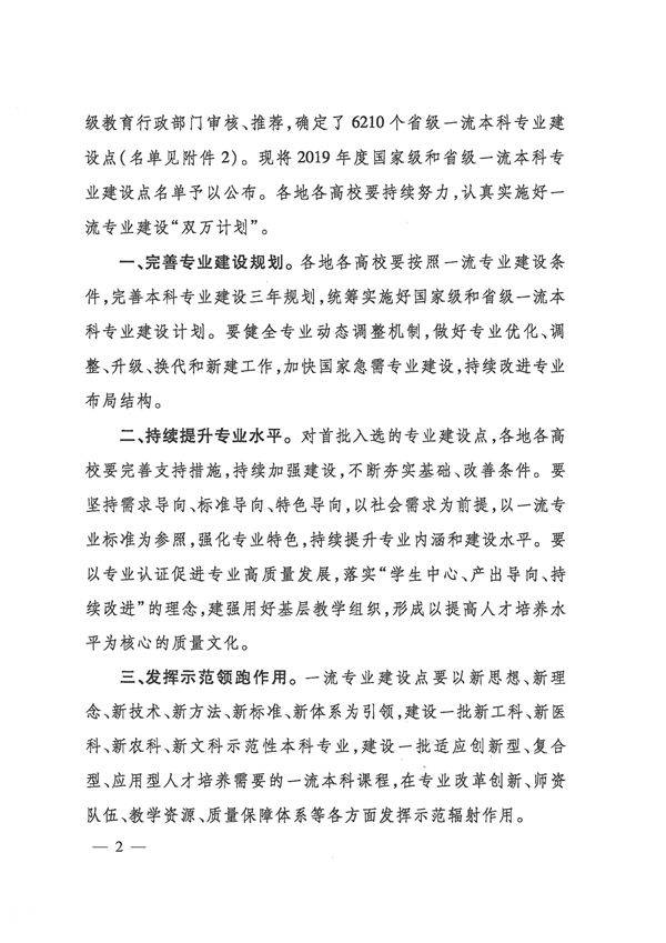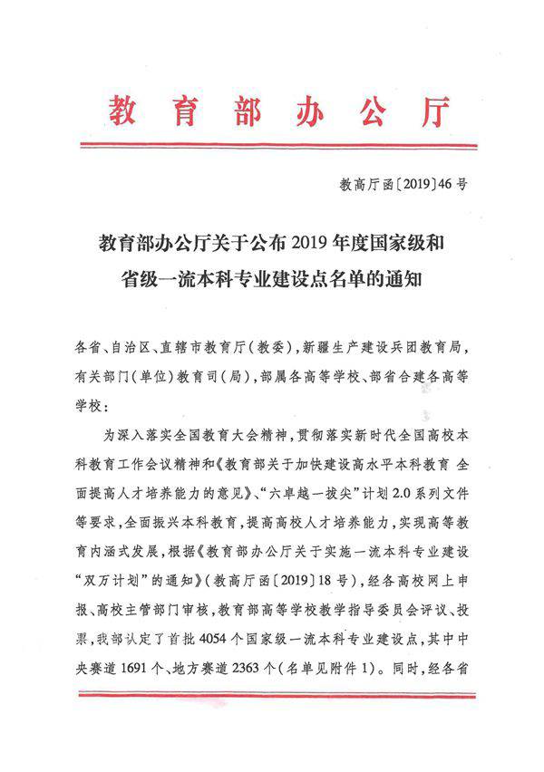 一流专业认定是教育部加快建设高水平本科教育的重要举措。2018年教育部下发了《实施一流本科专业建设“双万计划”的通知》,计划三年时间内建设1万个国家级一流专业和1万个省级一流专业。2019年教育部首批认定了4054个国家级一流本科专业建设点和6210个省级一流本科专业建设点。下一步,教务处将在学校统一部署下与各教学单位一起,坚守初心与使命,坚持立德树人为国育才,进一步完善专业建设规划,持续提升专业水平,发挥一流专业的示范领跑作用,持续深化本科教育教学改革,加快一流本科建设,全面提高人才培养质量。