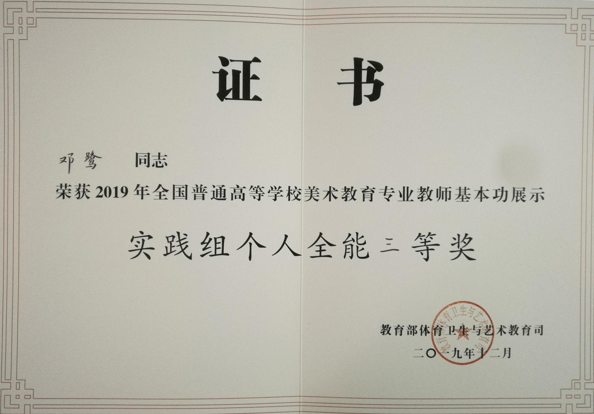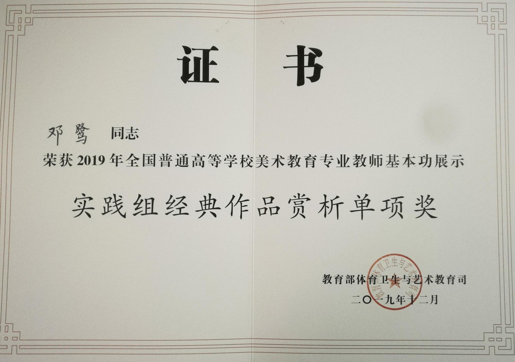 本网讯 日前,教育部公布了2019年全国高校音乐美术教育专业教师基本功展示评选结果,贵州省共获得6个奖项,其中美术类2个、音乐类4个。beat365教师共获得其中4个奖项:美术与设计学院邓鹭教师在美术专业教师基本展示中获得个人全能奖实践组三等奖、个人单项奖实践组经典作品赏析单项奖;音乐与舞蹈学院王铎老师在音乐专业师基本展示中获得个人全能奖教法组三等奖、个人单项奖教法组专业展示单项奖。