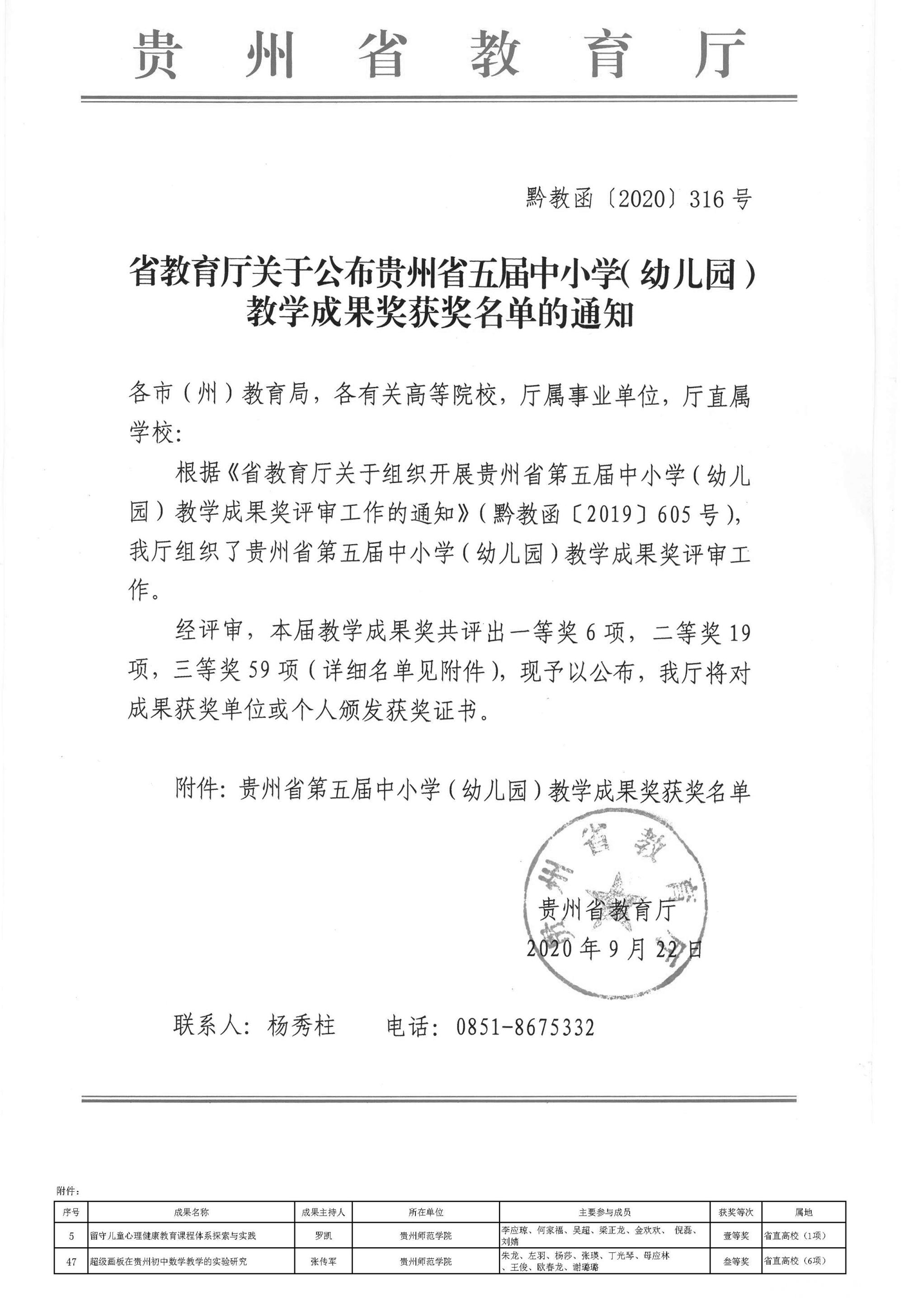 本网讯 由贵州省教育厅主办的贵州省第五届中小学(幼儿园)教学成果奖评选活动,经过各单位组织申报、省教育厅评审委员会评审,并将评审结果进行公示后,近期省教育厅下发了《省教育厅关于公布贵州省五届中小学(幼儿园)教学成果奖获奖名单的通知》(黔教函〔2020〕316号)。beat365教育科学学院罗凯的《留守儿童心理健康教育课程体系探索与实践》荣获一等奖,是省直高校中唯一获得一等奖的高等院校;教育科学研究所张传军的《超级画板在贵州初中数学教学的实验研究》荣获三等奖,在省直高校中beat365为6项三等奖获奖院校之一。希望老师们再接再厉,再创佳绩!