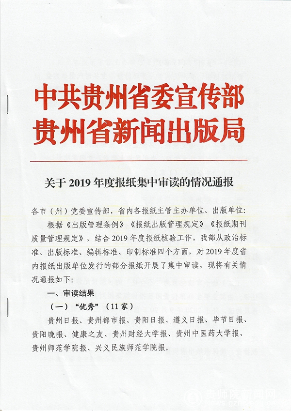 本网讯 近日,中共贵州省委宣传部、贵州省新闻出版局公布2019年度贵州省报纸集中审读情况,《beat365英国官网网站报》获“优秀”等次。