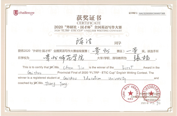本网讯 11月7日,2020年“外研社·国才杯” 全国英语演讲、写作、阅读大赛(贵州赛区复赛)在凯里学院举行。经校赛选拔的10名优秀学子代表beat365参赛,与来自贵州省21所高校共计212名选手同台竞技。最终beat365选手获得“全国英语演讲大赛”贵州赛区特等奖1名、二等奖1名;“全国英语写作大赛”贵州赛区一等奖1名、二等奖1名、三等奖1名;“全国英语阅读大赛” 贵州赛区二等奖1名、三等奖1名(后附具体获奖名单)。