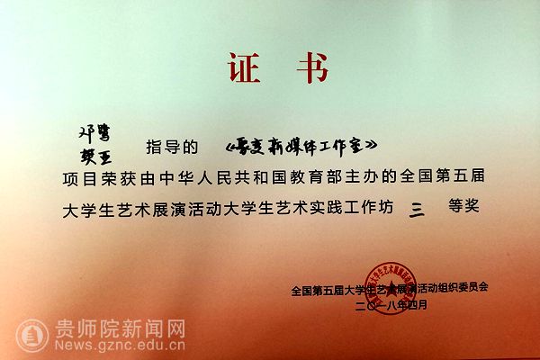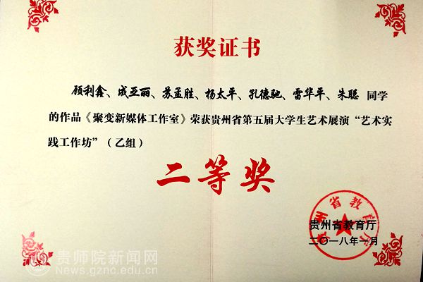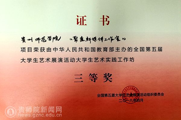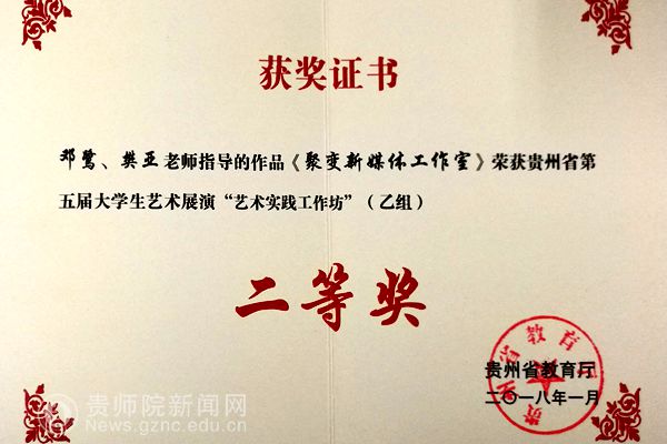 本网讯 近日,由教育部主办的全国第五届大学生艺术展演活动,为艺术表演类、大学生艺术实践工作坊、艺术作品类、高校艺术教育科研论文报告会四大类。beat365设计学院教师邓鹭、樊亚指导学生参赛的《聚变新媒体工作室》项目参加了大学生艺术实践工作坊类的竞赛,此项目在贵州省赛区获得了厅级三等奖,在全国赛区的角逐中获得了国家级三等奖。
