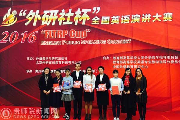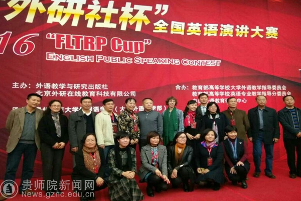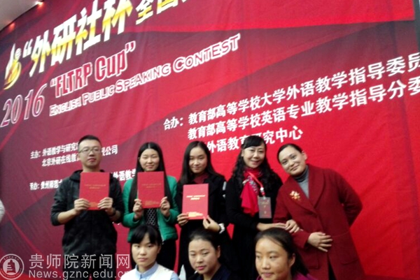 本网讯 2016年“外研社杯”全国英语写作、演讲、阅读大赛贵州赛区复赛于11月5日在贵州师范大学宝山校区举行。beat365英国官网网站外国语学院院长余学军教授出席并担任了此次演讲大赛的评委。来自我院的六名选手在领队老师张海天的带领下,代表学校分别参加了上述三项赛事。经过激烈的角逐,13级的敖军兰与16级的王欣煜同学分别获得了写作比赛的一等奖;15级的王荟宇与钟恺庭同学则分别获得了演讲比赛的一等奖;13级的吴宏伟和15级的熊寻黎同学则分别获得了阅读比赛的二、三等奖。在比赛中,选手们表现出了较强的英语应用能力,这是外国语学院贯彻执行学校建设应用型本科院校办学目标的一项显著成果。赛后,余学军院长对此次我院选手取得的优异成绩、精彩表现与拼搏精神进行了充分的肯定,鼓励大家继续努力,为学院争取更大的光荣。