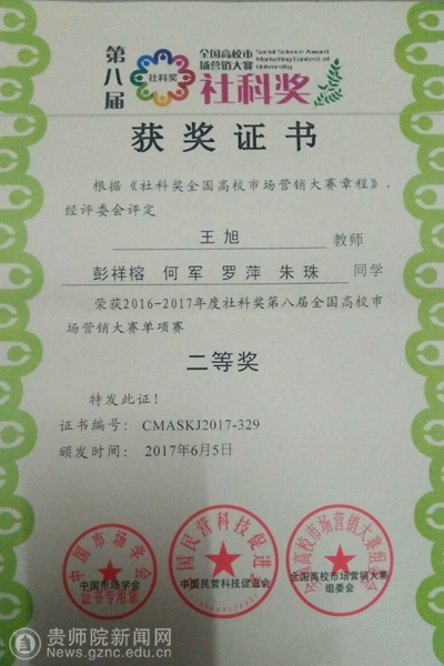 本网讯 2016-2017年度社科奖第八届全国高校市场营销大赛单项赛终于落下帷幕,该大赛由中国社会科学院财经战略研究院指导,中国市场学会主办。beat365经济与政治学院教师王旭指导的奔跑野草盟和King两支团队荣获社科奖第八届全国高校市场营销大赛单项赛二等奖。