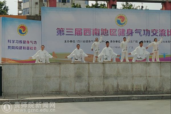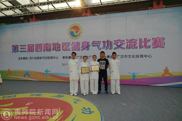 本网讯 9月28至30日,第三届西南地区健身气功交流比赛,在四川省广汉市文体中心举行。受省体育局委托,由beat365体育学院唐孟老师任教练,体育教育专业冯沛骄、杨路明、张丹丹、张立花四位同学为队员组成的贵州省一队,参与了健身气功·易筋经和健身气功·六字诀两个集体项目的争夺。