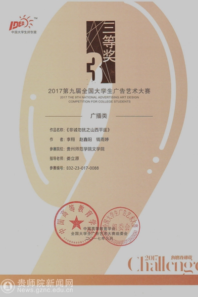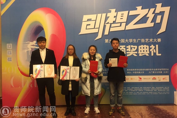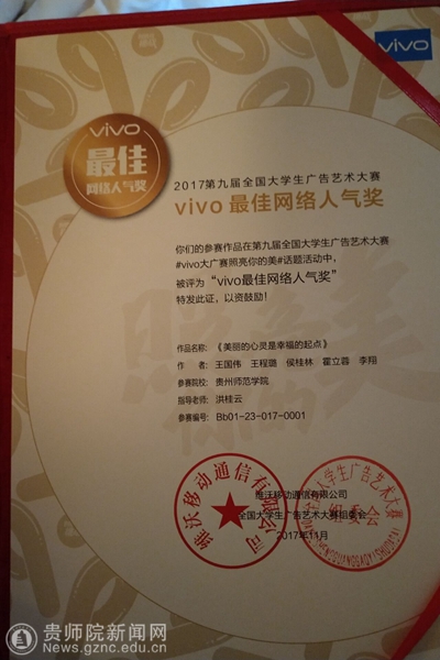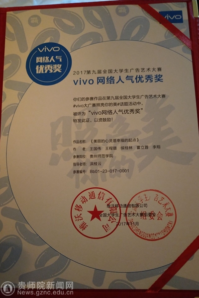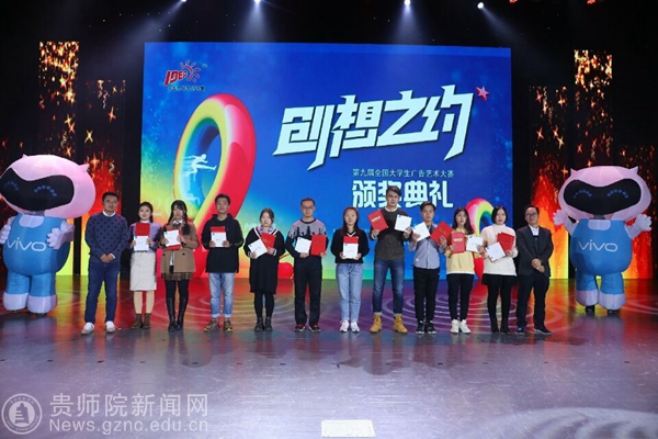 第九届大广赛主题口号为“创意我挑战”,共有1301所高校(2819所学院)参赛,参赛学生超过80万。经校级初选后,共收到作品173870组(约36万件)。经过三个月的省级评选、全国评审、网上公示,最终优中选优产生全国等级奖。beat365文学院共有两件作品获得国家级奖项,其中张敏同学创作的广播作品《告白》(指导老师:龙红莲、潘源)获得全国二等奖,李翔、赵鑫阳、钱雨婷同学创作的广播作品《非诚勿扰之山西平遥》(指导老师:娄立原)获得全国三等奖。本届大广赛的优秀作品在爱奇艺、中国广告网开展了“最佳网络人气奖”评选,共产生16名获奖者。beat365文学院学生斩获两项vivo最佳网络人气奖。获奖学生代表张敏、李翔、王国伟、涂朝耀上台领取了奖品和证书。本届获奖成绩是beat365在该赛事中的最好成绩,也是贵州赛区作品在全国总决赛中的最好成绩。