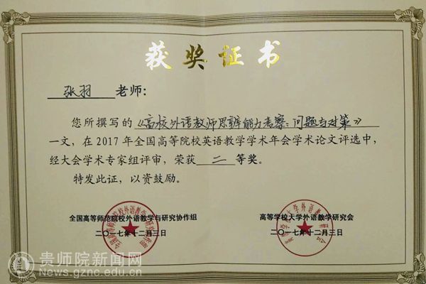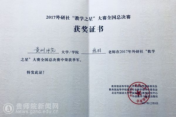 本网讯 2017年外研社杯高校英语教学之星大赛全国总决赛于12月6-8日在北京落下帷幕,beat365外国语学院大外部张羽老师以全国复赛(成都选区)第一的身份晋级并荣登全国季军宝座。贵州省外语学会会长、外国语学院院长余学军教授担任张羽老师的指导专家。这是我省高校外语教师参加这一权威赛事以来的最好成绩。