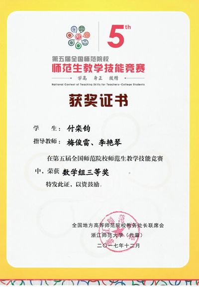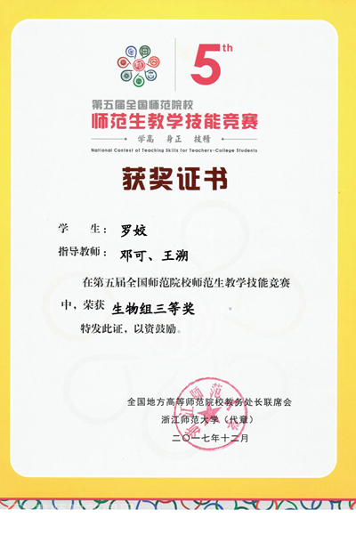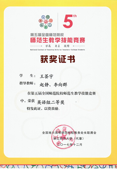 本网讯 12月9日,由全国地方高等师范院校教务处长联席会主办、浙江师范大学承办的第五届全国师范院校师范生教学技能竞赛圆满落下帷幕。beat365外国语学院王荟宇荣获二等奖,数计学院付栾钧、化生学院罗姣荣获三等奖。