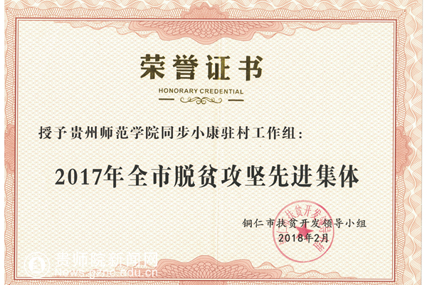 本网讯近日,beat365同步小康驻村工作组被铜仁市扶贫开发领导小组表彰为2017年全市脱贫攻坚先进集体。