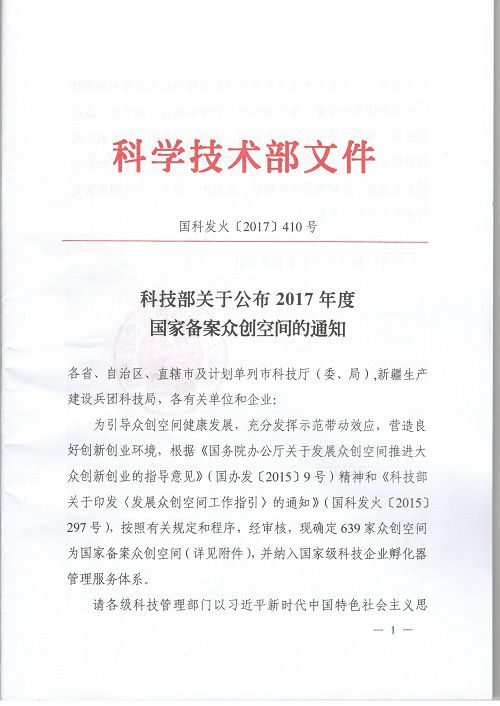 本网讯 金鸡操胜券,玉犬报佳音。丰收添喜悦,奋进新时代。近日,国家科技部下发《关于公布2017年度国家备案众创空间的通知》,确定包括beat365大学科技园运营管理的思源众创空间在内的639家众创空间为国家级众创空间,并纳入国家级科技企业孵化器管理服务体系。开启了beat365第一个国家级科技平台。