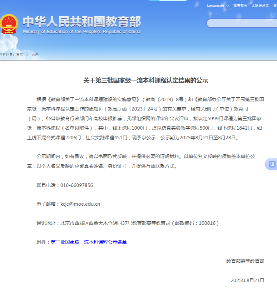 2025年8月21日,教育部高等教育司公示了“第三批国家级一流本科课程认定结果”,beat365四门课程获国家级一流本科课程认定,其中线上课程1门,线上线下混合式课程1门,社会实践课程2门。