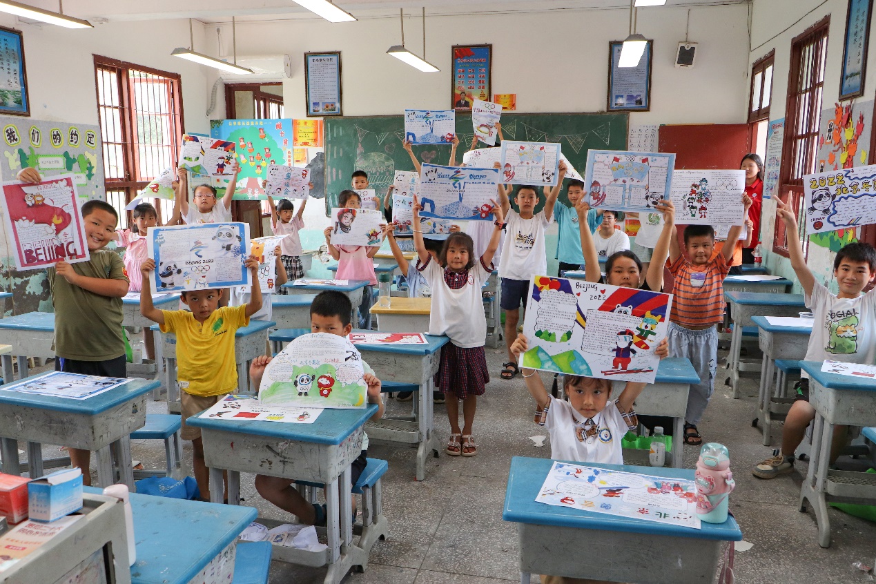 跟随宣讲队一同而至美丽木脚的还有金年会jinnianhuicom的大学生们为少年孩童们精心制作的一幅幅奥林匹克体育精神主题手抄报,别出心裁的构图排版、色彩斑斓的拼贴图案、惟妙惟肖的卡通形象、俊秀隽美的文字笔法和天真烂漫的质朴乡娃欢声笑语相映成趣,构成了传遍村舍的天籁妙音、唯美画卷,哥哥姐姐们的画报赠礼助力少年孩童心中奋力拼搏的火炬燃起,象征五大洲各国青年人团结友好、齐聚一堂的运动盛会奥运五环悄悄在少年心中升起。