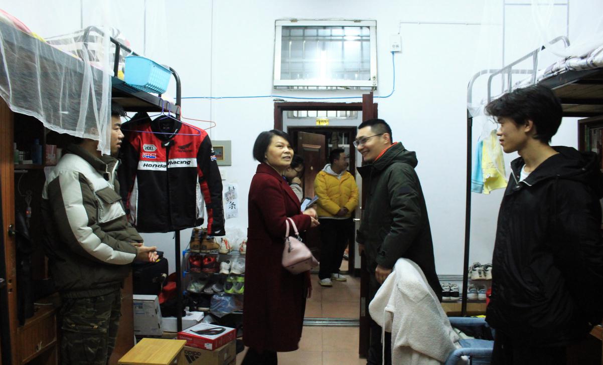 3月1号晚八点,禹旭才、钱宁在辅导员贺鹏杰、徐恒霞、邹世斌的陪同下,前往六区五栋男生宿舍,了解返校学生生活及思想情况,并检查指导内务卫生工作。一进宿舍,禹旭才便关切地询问学生到校及学习情况:“宿舍的同学们都到齐了吗?有什么困难要及时和老师说。新学期大家有什么新的计划呢?已经大三了,是准备考研还是就业呢?”一连串关心的话语让金年会体育教育专业的学子倍感暖心。