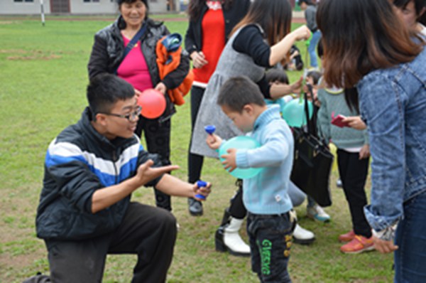 下课铃响,孩子们在老师的带领下走出教室。起初,孩子们因为认生而不敢与志愿者们接近。但经过家长的努力,孩子们勇敢地伸出了自己的双手,和志愿者们牵在了一起。游戏互动、舞蹈教学,志愿者与孩子们立刻融成一片。科技部部长刘根更是使出了自己的“杀手锏”——近景魔术,每变出一个气球时,孩子们便兴奋地不停鼓掌。