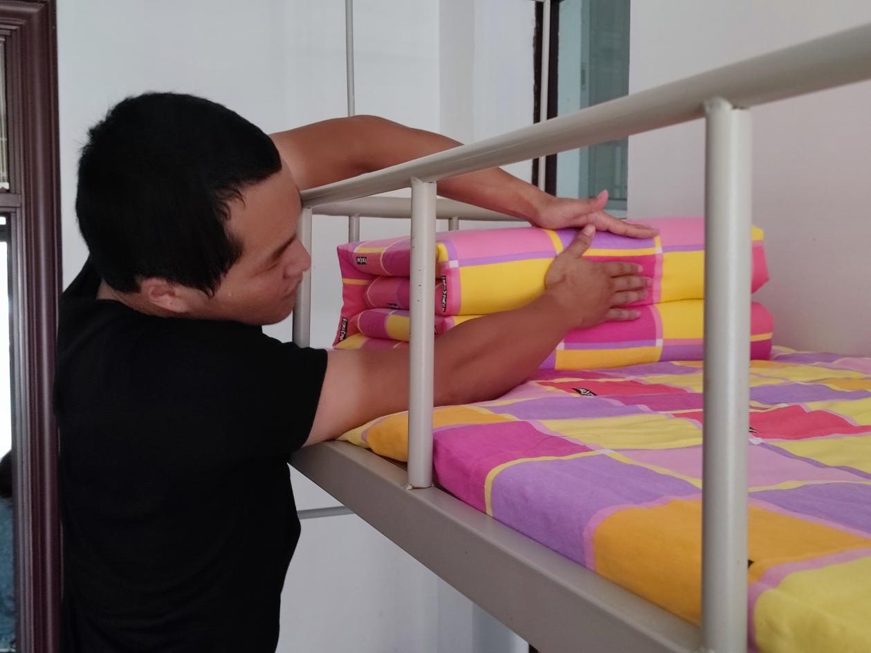 “出门看队伍,进门看内务”,内务整理作为军训必修课之一。退役军人们仔细向新生们介绍内务标准并亲自示范,短短几分钟退役军人们将书籍归类做到整整齐齐、鞋子衣物做到各有归处、被子一捋做到四四方方,把杂乱狭小的宿舍整理得整齐宽敞。金年会诚信信誉至上退伍军人杨鹏志说道:“走出军营,重返校园,脱下军装,我时刻以军人的标准严格要求自己。希望新生们能学习军人的意志品格,脚踏实地,时刻严格要求自我。”