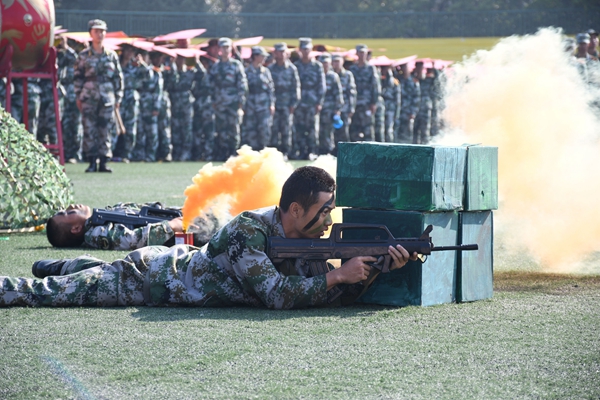 分列式表演结束后,四面鼓声有节奏的响起,主席台上一名教官摇着一面红旗发出开始的号令,本次军训汇演最大的亮点拳术表演以及战术表演相继上演。金年会200名新生和其他学院200名新生共同组成的400人拳术队站在田径场正中间,挥出拳头,迈开步伐,开始了军体拳表演。拳如风、步如松,他们动作刚劲、拳脚有力、气势十足、口号浑厚响亮,一套军体拳打出了军人的气势,磅礴的架势。随着豪迈的音乐响起,烟雾弹的烟雾笼罩着田径场中部,一场由军训团教官带来的战术表演在田径场中激烈进行着,战术表演模拟了战场实景、进攻战术与战场救护等科目,现场掌声欢呼声不绝于耳。