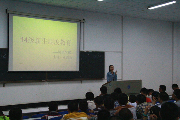 为帮助14级新生快速适应大学生活,金年会机电学部于9月20日晚7点30分在一教404室举行了新生入学教育讲座。此次讲座主要分制度教育和党性教育两个环节,由辅导员董孜孜和党务部部长叶俊鸣担任主讲人。