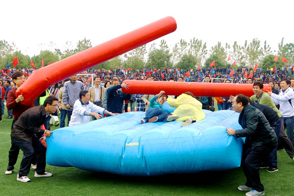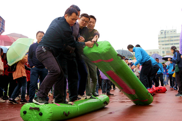 作为教职工大赛的重头戏,“滚滚向前”压轴进行。每支队伍需要用充气滚轴承载着气垫交替前进。赛前所有队伍热火朝天讨论着战术,力求用最短的时间冲过终点,“三根滚轴就够了,要速度快。”“我看三根不够稳啊,你在旁边要扶稳一点。”外国语学院代表队杨晴老师坐在气垫上,在比赛中常被队友们传递的滚轴撞倒头,于是她索性侧卧下来,“我们降低了高度,这样滚轴的传递就会更快一些,队伍也走得更稳些。”
