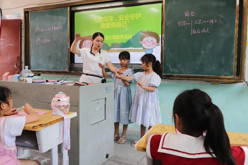 为让乡村留守儿童合理地运用法律武器维护自身的合法权益,共筑和谐美好的成长环境,实践团法学专业志愿者成立普法小组,开展有关校园欺凌、走失与拐卖、未成年人网络沉迷等相关问题的普法课程。通道县乡镇社工站成员通过“做游戏、看电影、读故事、喊口号”等多种形式为学生们讲授“我爱我自己”“防范儿童性侵”等相关主题的普法知识,共同加强法治宣传教育,提高普法质效。