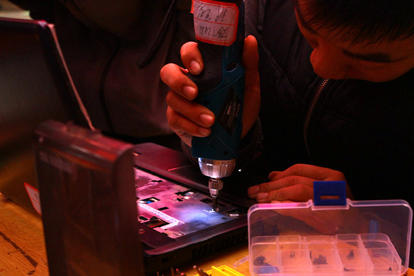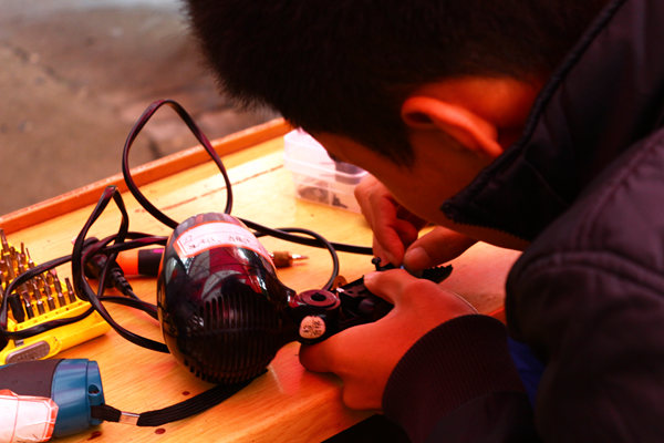 29日早晨六点左右,八区摆点处负责人陈长富带着委员们开始着手准备摆点工具,借来桌子,从宿舍搬来凳子,接通电源……八点,义务维修正式开始。不一会就有同学陆续送来了需要维修的电器,台灯、插板、电脑、吹风机、电风扇、收音机等摆满了整个桌子。